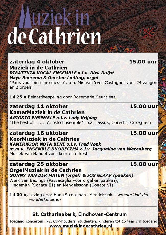 • 18 oktober 2014: Koormuziek in de Cathrien, optreden in de Catharinakerk in Eindhoven.