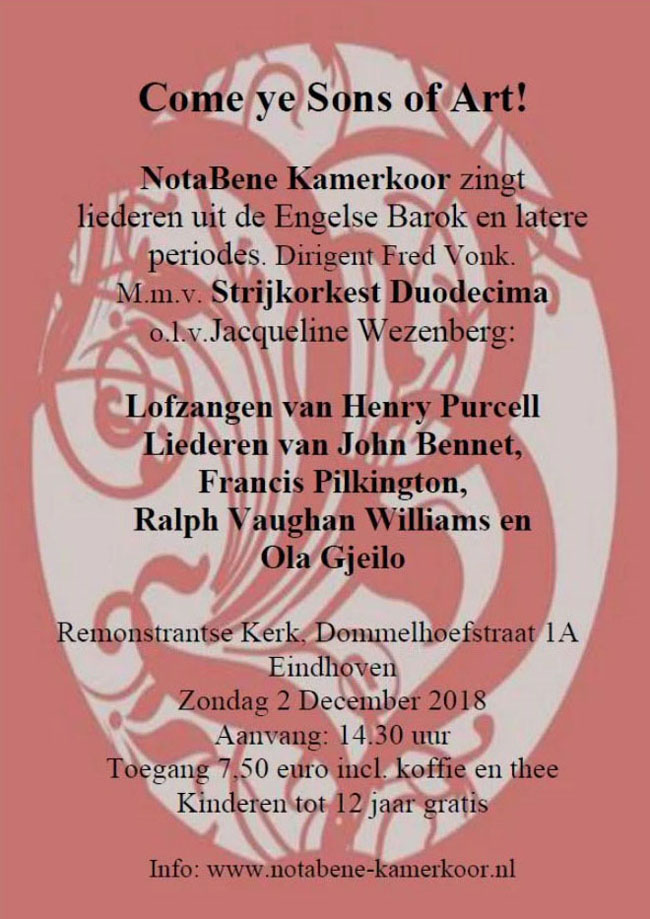 • Het concert ‘Come ye Sons of Art’, uitgevoerd in samenwerking met het Eindhovens barokorkest Duodecima, werd tweemaal gezongen. Het weerklonk op 2 december in de Remonstrantse kerk in Eindhoven en nogmaals op 6 januari 2019 in de mooie concertzaal van Kasteel Heeswijk. O.l.v. dirigent Fred Vonk werd werk gezongen van Henry Purcell, John Bennet, Ralph Vaughan Williams en de hedendaagse componist Ola Gjeilo.