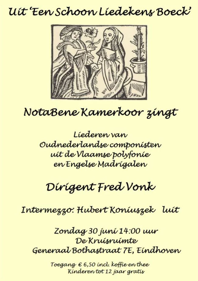 • Het voorjaarsconcert ‘Uit een Schoon Liedekens Boeck’ werd op 30 juni 2019 uitgevoerd in de tuin van De Kruisruimte in Eindhoven. Het koor zong o.l.v. dirigent Fred Vonk werk van Oud-Nederlandse componisten uit de Vlaamse polyfonie (Despréz, Gombert, Obrecht). Zestiende-eeuwse Engelse madrigalen (Morley, Bennet, Weelkes) vulden het concert aan. Hubert Koniuszek begeleidde enkele liederen op luit en verzorgde een muzikaal intermezzo.