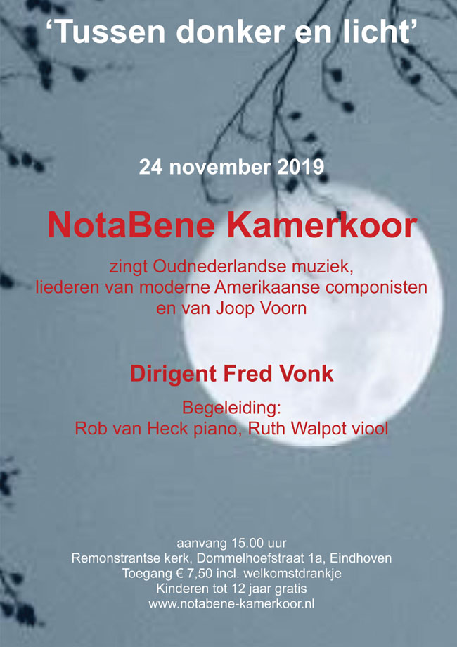 • Tijdens het hoofdconcert op 24 november ‘Tussen donker en licht’ werden o.l.v. dirigent Fred Vonk Oud-Nederlandse liederen gecombineerd met moderne Amerikaanse componisten (Copland, Glass, Whitacre). Begeleiders waren Rob van Heck (piano) en Ruth Walpot (viool).